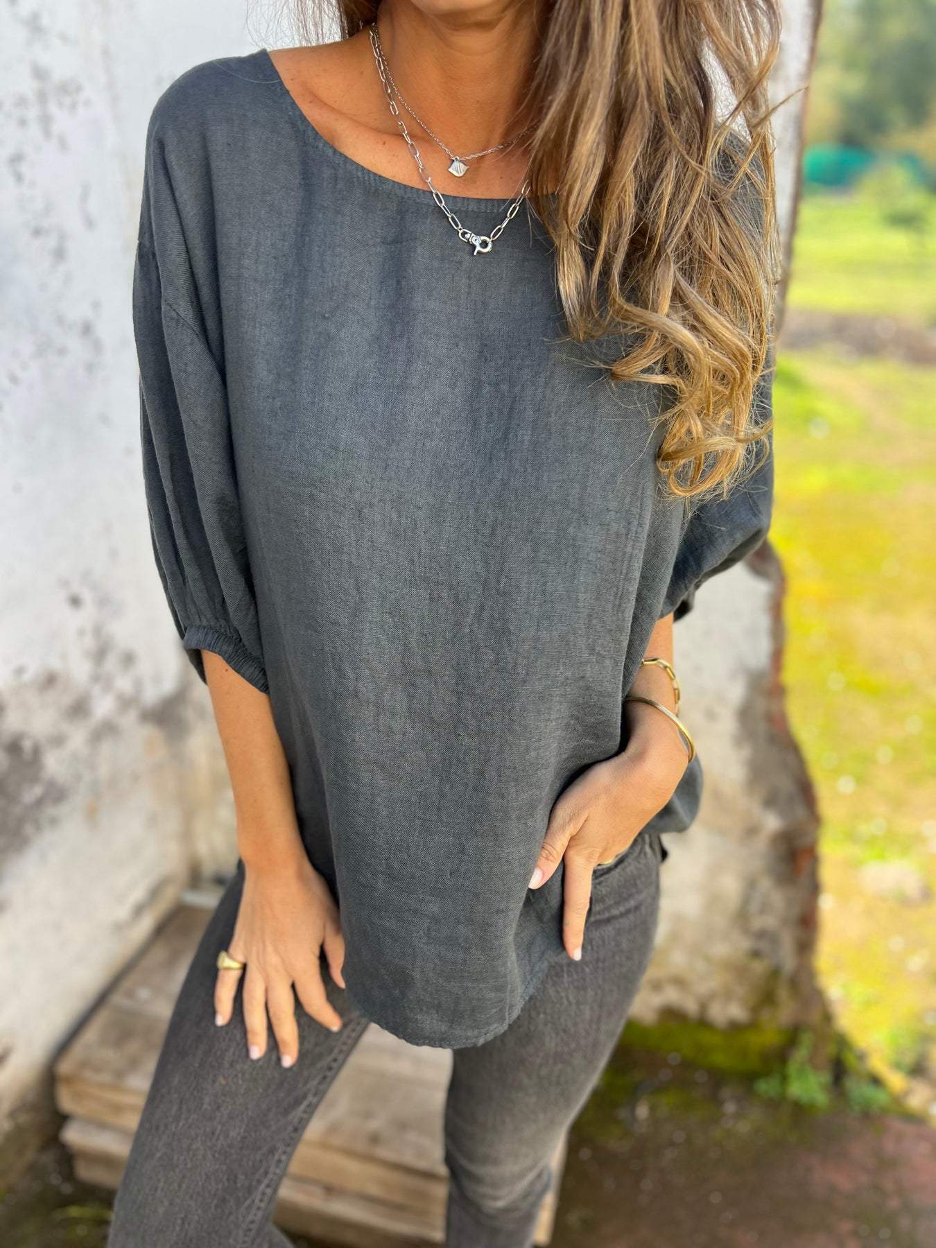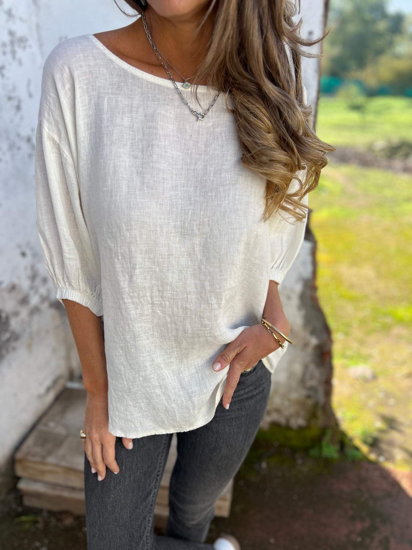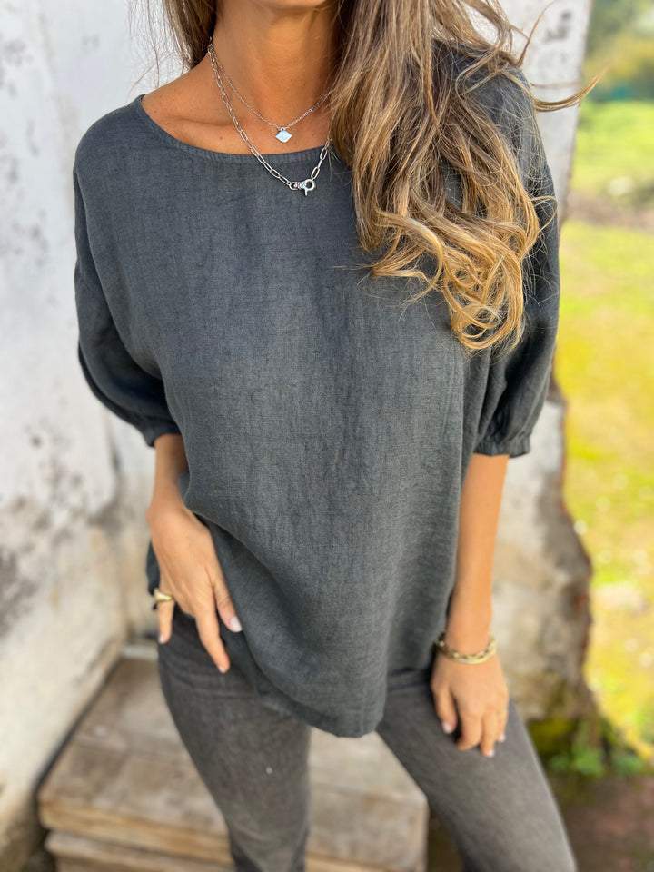 Damski top z okrągłym dekoltem i średnim rękawem, z bawełny i lnu, na co dzień
