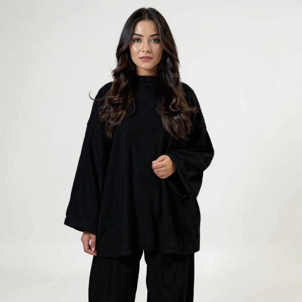 Połączenie luźnej bluzki z prostymi rękawami i dopasowanych spodni z wygodnym pasem zapewnia równowagę między swobodą ruchów a spokojnym, stylowym wyglądem.